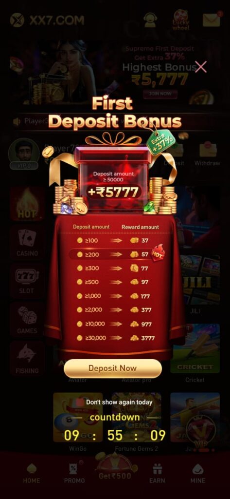 Once you download the XX7 Game Apk and complete registration, new users are eligible for a Rs.500 welcome bonus. This bonus allows you to explore games without immediately dipping into your own pocket.